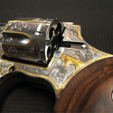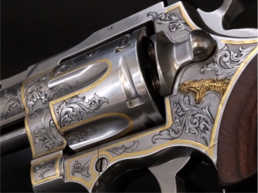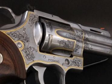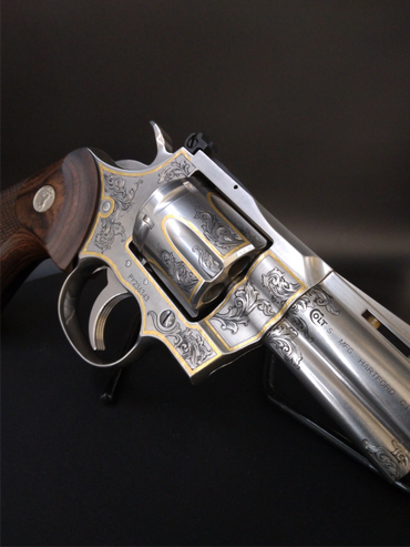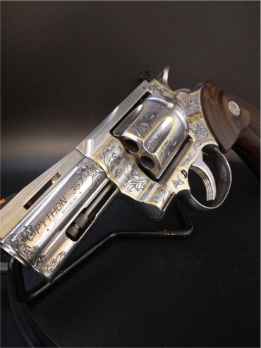 Colt Python - hand drawn, engraved, and laser asst. 18k gold inlay tracing edges, and sculpted snake with diamond eye. Cylinder fully edge-traced in 18k gold as well.