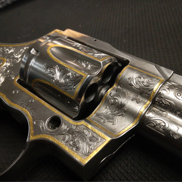 This fully engraved Springfield is a combination of Hand drawn, hand engraved, laser assist. 24k gold accent bordering slide with high polish nickel and black-fill finish.